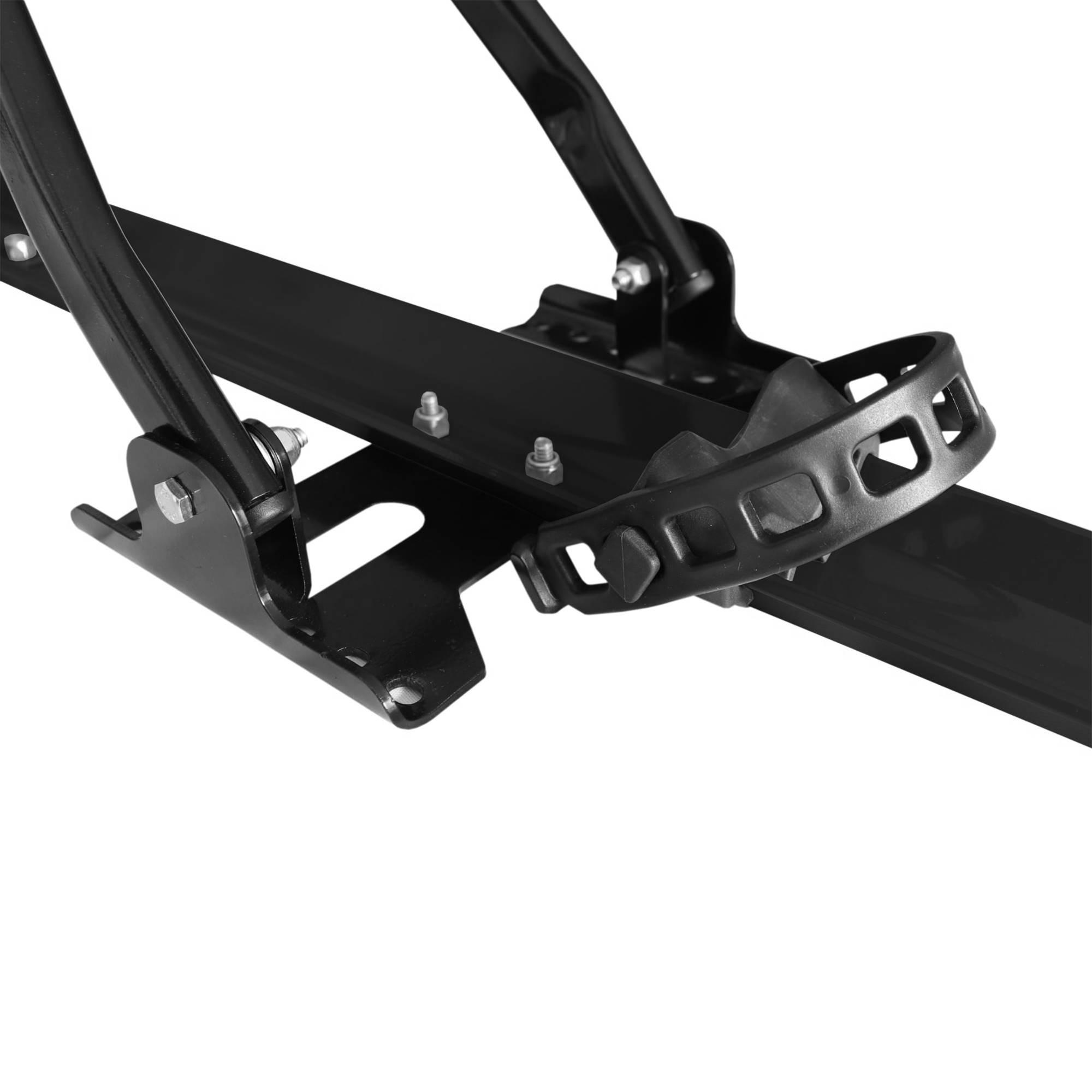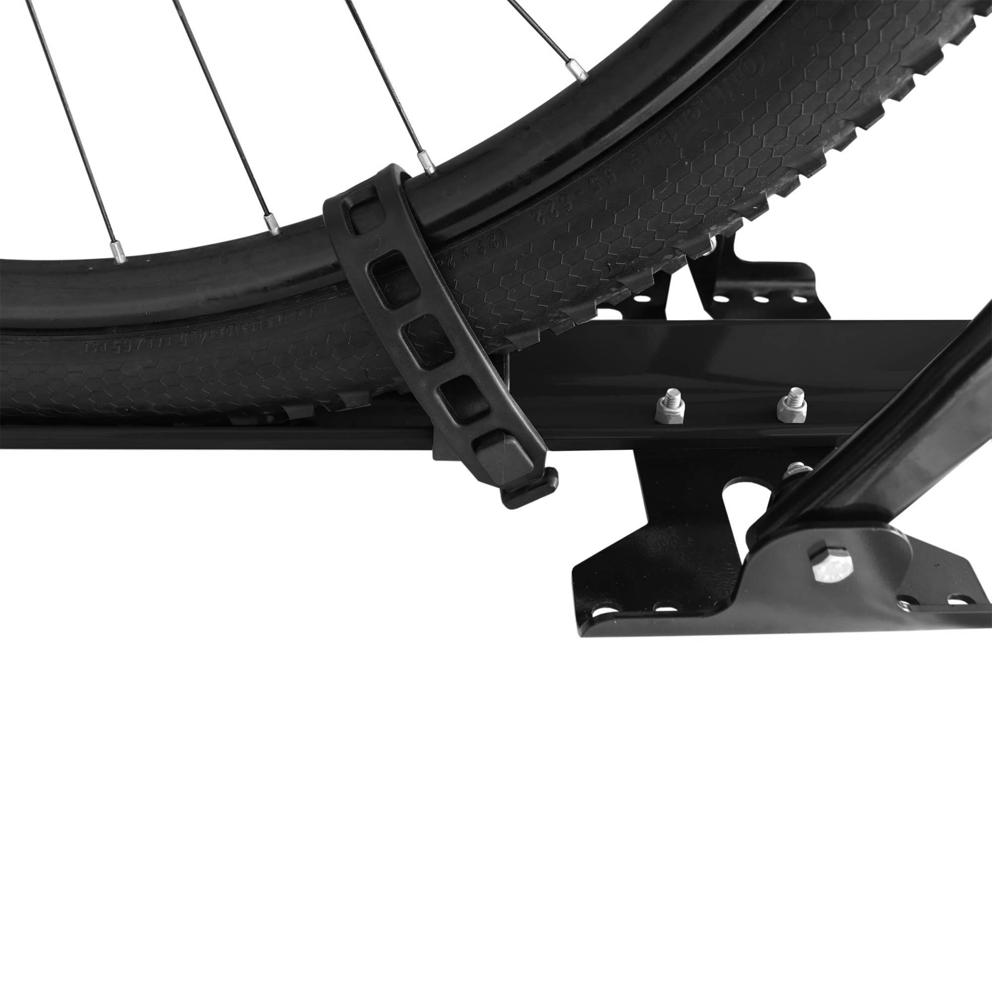 Prende a bike pelo quadro com braços de fixação e pelas rodas com abraçadeiras de borracha;