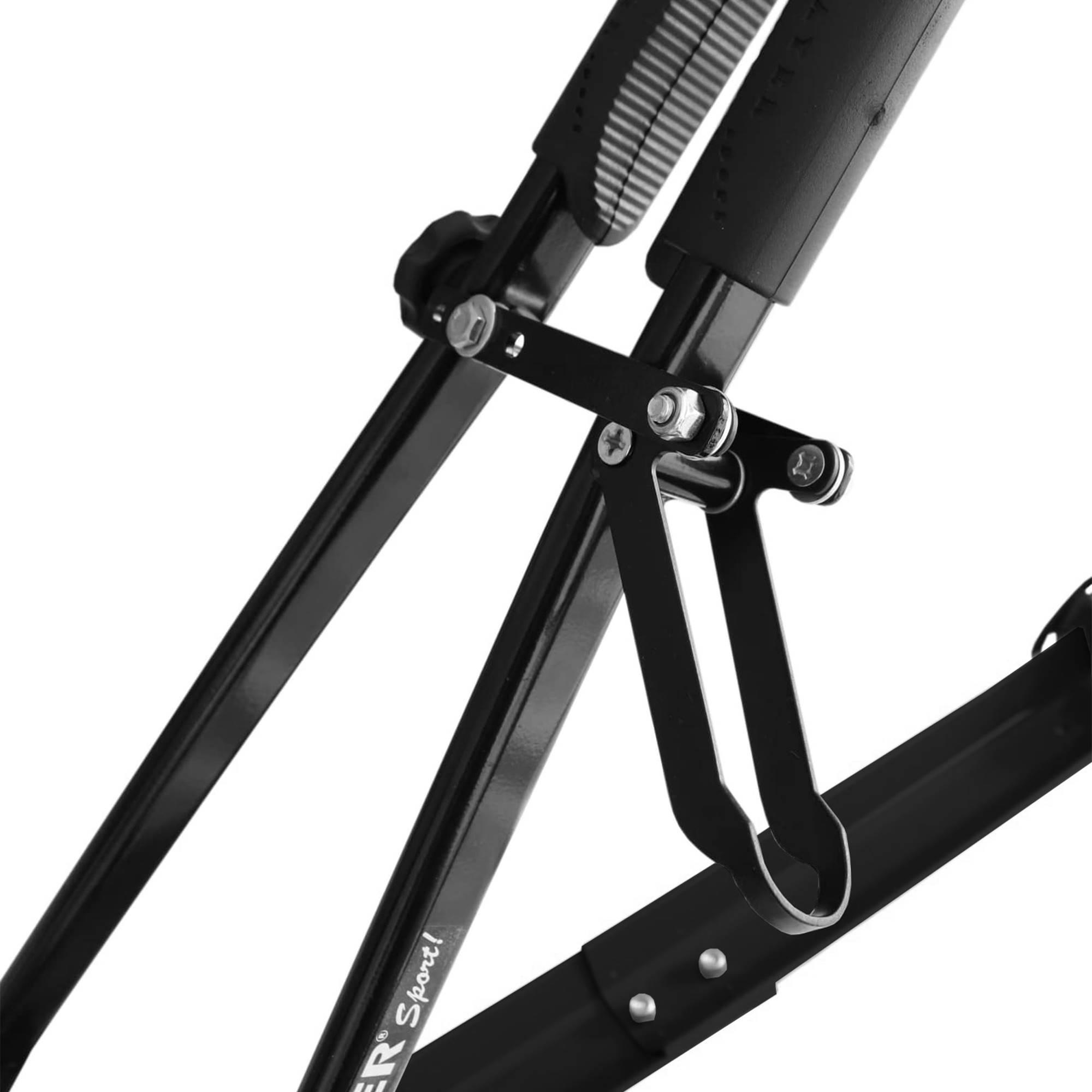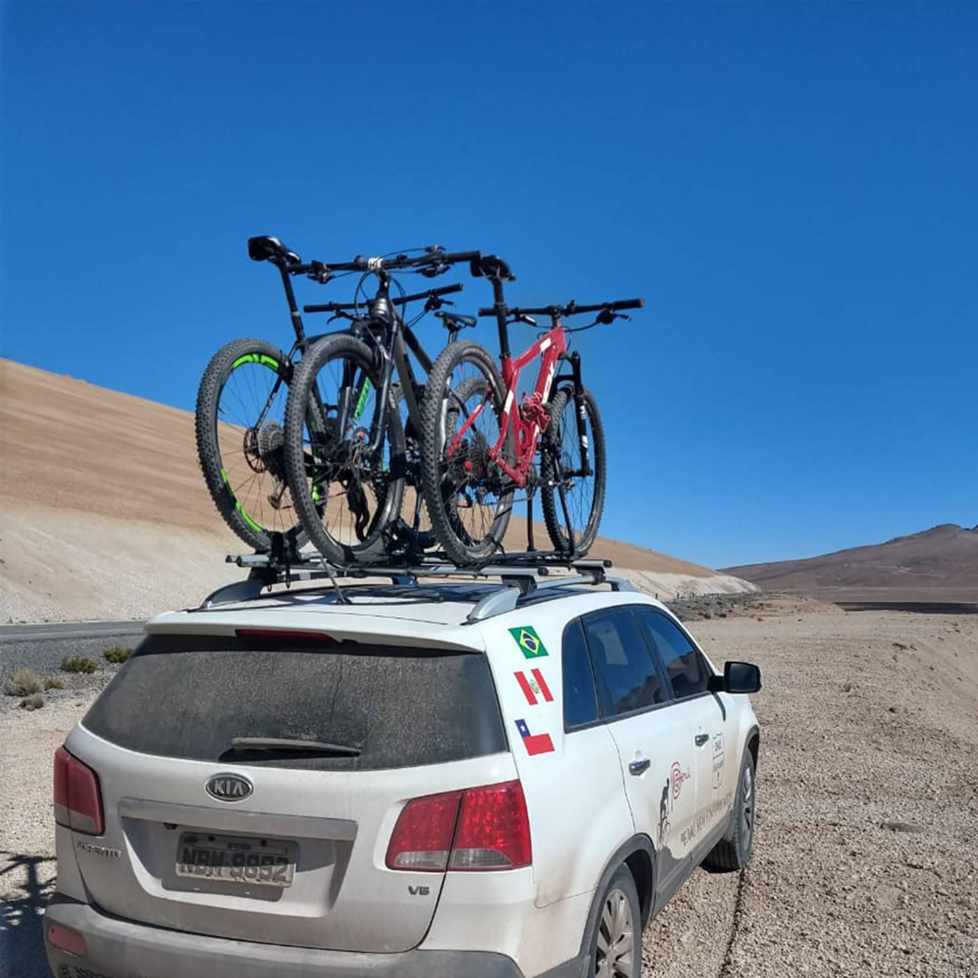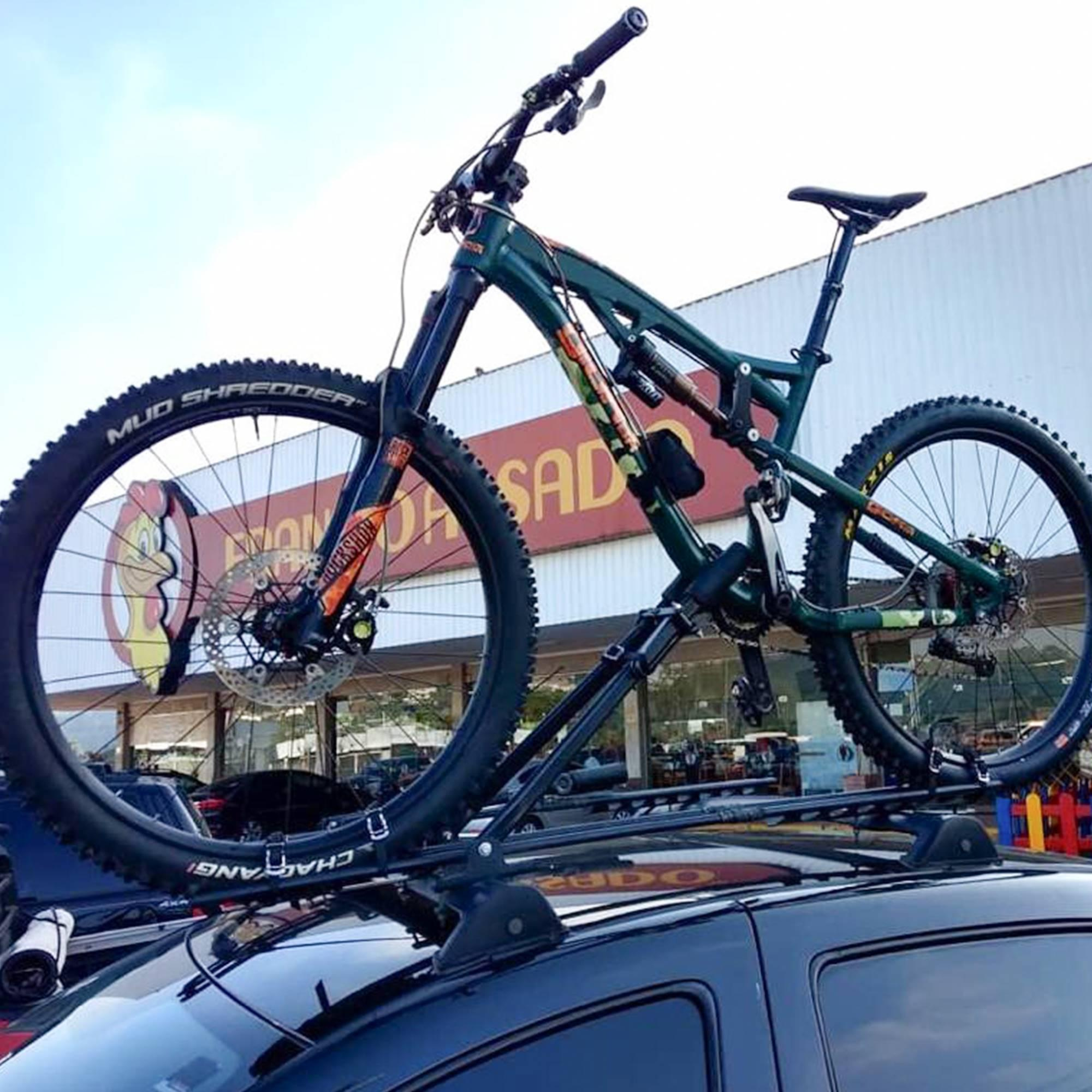 Prende a bike pelo quadro com braços de fixação e pelas rodas com abraçadeiras de borracha;